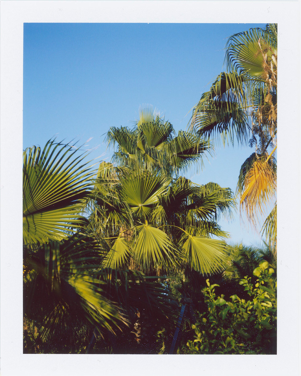 Polaroids, belichtet am Fuße des Ätna, die Kamera in Richtung Krater gerichtet, teilweise ist der Blick jedoch durch Palmen verdeckt.