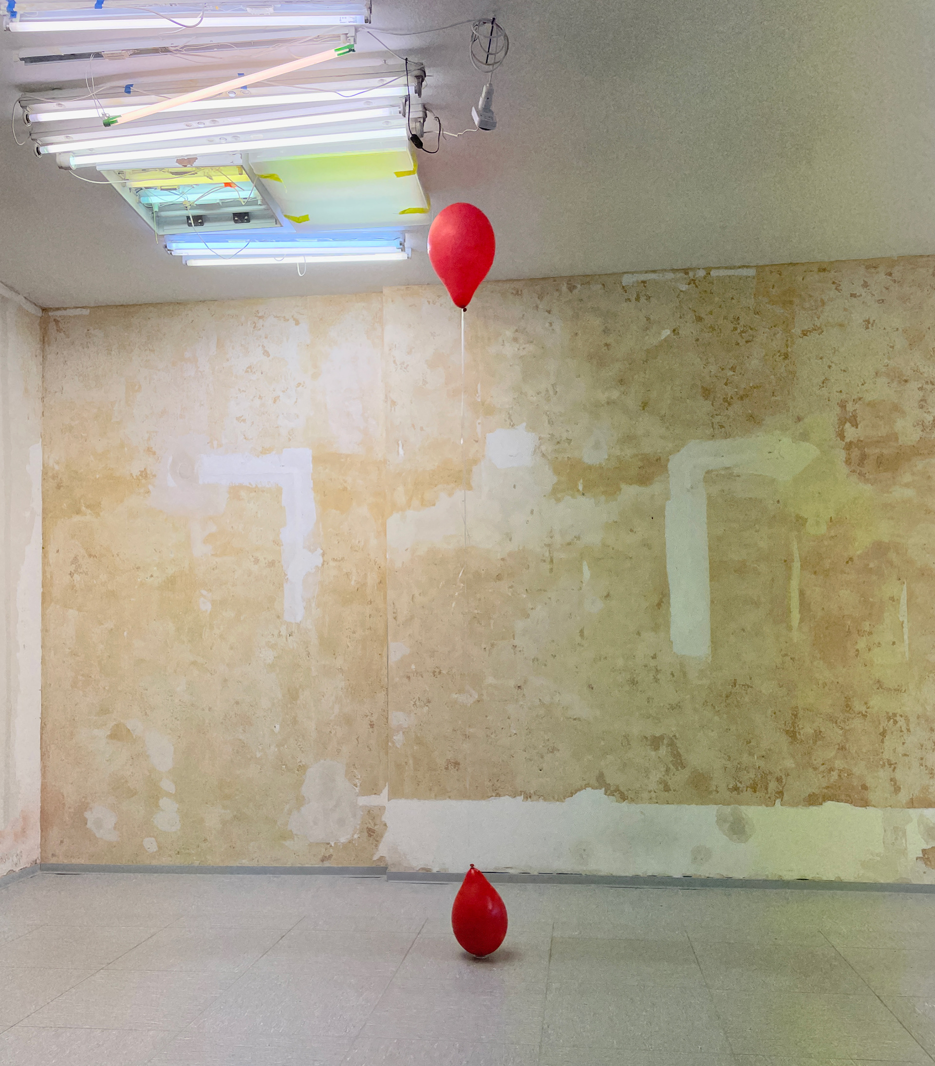 A.-K.G.: Du hältst damit ja auch etwas Ephemeres fest, hinderst es, am Verschwinden. Auch Deine zweite Arbeit, die Du in Essen zeigst, die beiden Luftballons, die sich aufeinander zubewegen, verändern ihre Gestalt, Luft entweicht und doch bleiben sie irgendwie immer gleich, oder? Oder fangen sie während der Ausstellungsdauer an zu schrumpeln?