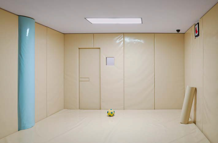 In „3×4, Time-Out“ (2020) ist ein mit Beigefarbenen Matten ausgekleideter Haftraum zu sehen, der als sichere Maßnahme bei »unkontrollierten Aggressionsschüben« beworben wird. Farbliche Akzente und bewegliches Mobiliar sollen hier ein positives Umfeld erzeugen.
