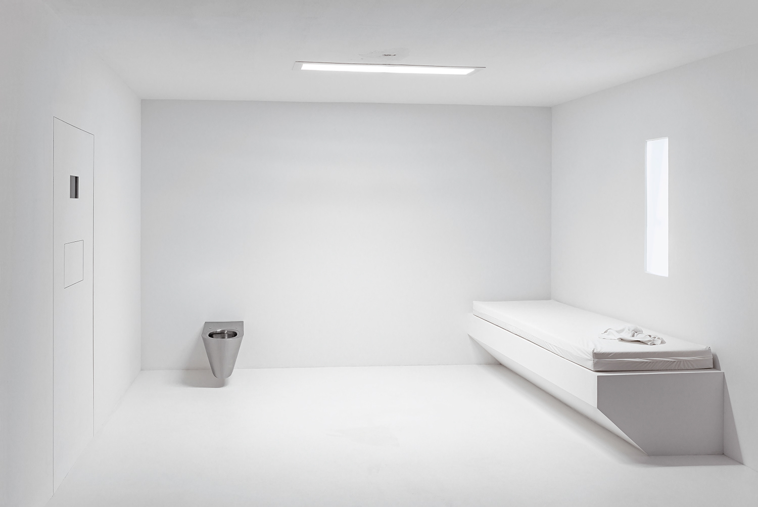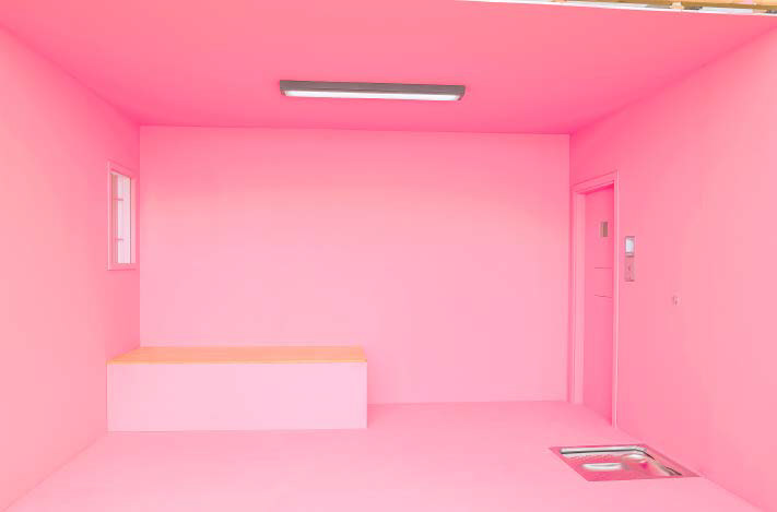 Die erste Arbeit der Serie, „3×4m, Cool-DownPink“ (2018), zeigt eine Zelle, die vollständig in dem gleichnamigen patentierten Farbton gestrichen wurde, der eine »blutdrucksenkende« und damit »beruhigende« Wirkung auf Gefangene haben soll.