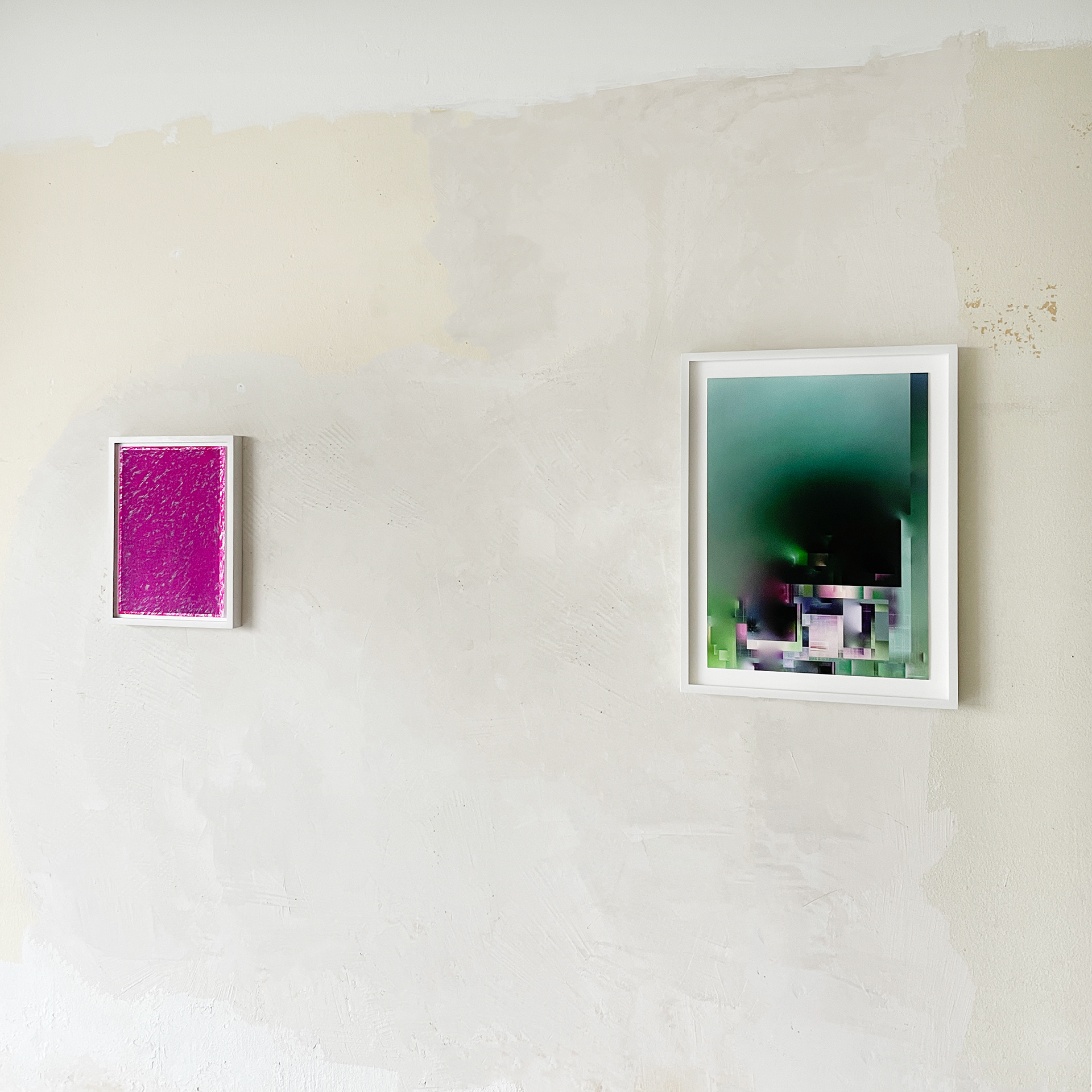 Ähnlich wie Schneidereit das Wesen der Fotografie erforscht, nähert sich auch Scheer in seinen Werken medienreflexiven Fragen. Dabei geht es ihm weniger um die fotografischen Qualitäten der digitalen Dateien, die er verarbeitet, als um eine Erweiterung des Verständnisses von Malerei. Malerei, die auch datenbasierte Techniken miteinbezieht. Deutlich ablesbar wird dies in der Arbeit DaNA XXIII, deren Betitelung, ein Akronym für „Defining a New Aesthetic”, ganz konkret auf die persönliche Auseinandersetzung und Selbstverortung des Künstlers im Spannungsfeld analoger und digitaler Medien verweist. Gleich einer weißen Leinwand steht hier zu Beginn das weiße jpeg, auf welchem der Künstler mit unterschiedlichen digitalen Werkzeugen Linien erschafft und überarbeitet, in gewisser Weise malt und zeichnet. (Stör-) Formen wie Pixel, Glitches und Blurs werden isoliert und in ihren neuen Zusammensetzungen und Wiederholungen zu malerischen Elementen, die der Künstler zu post-digitalen Landschaften verwebt. Diese finden schließlich als Pigmentdrucke ihre physische Präsenz im Ausstellungsraum.